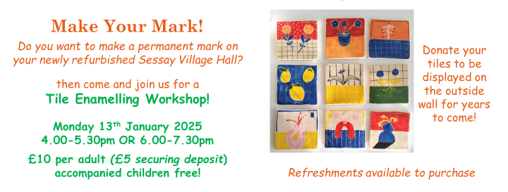 Contribute to a display at Sessay Village Hall. You are invited to take part in a workshop to create your own enamel tile to ‘Make Your Mark’ as part of the refurbishment. Suitable for adults and children. Afternoon and evening workshops to accommodate after school or after work! Your tile will be put on the gable end of the village hall.