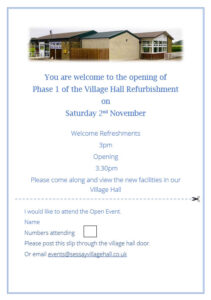 You are welcome to the Opening of Phase 1 of the Village Hall Refurbishment on Saturday 2nd November at 3:00 pm