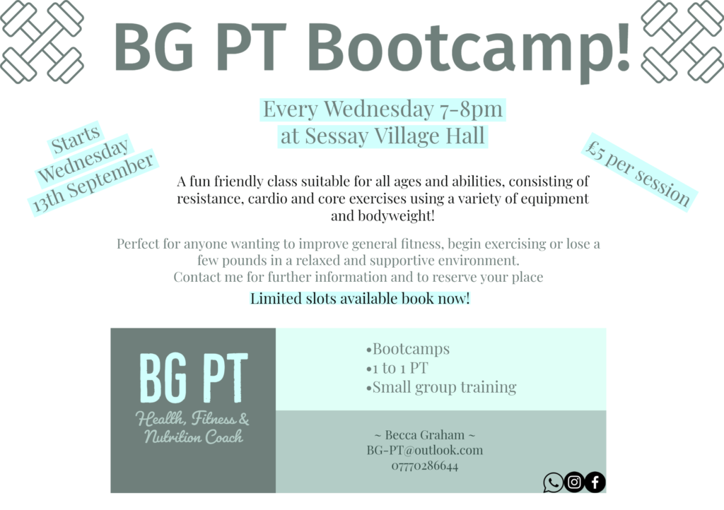 Weekly Fitness Class will start on Wednesday 13th September, 7-8pm. £5 per session.