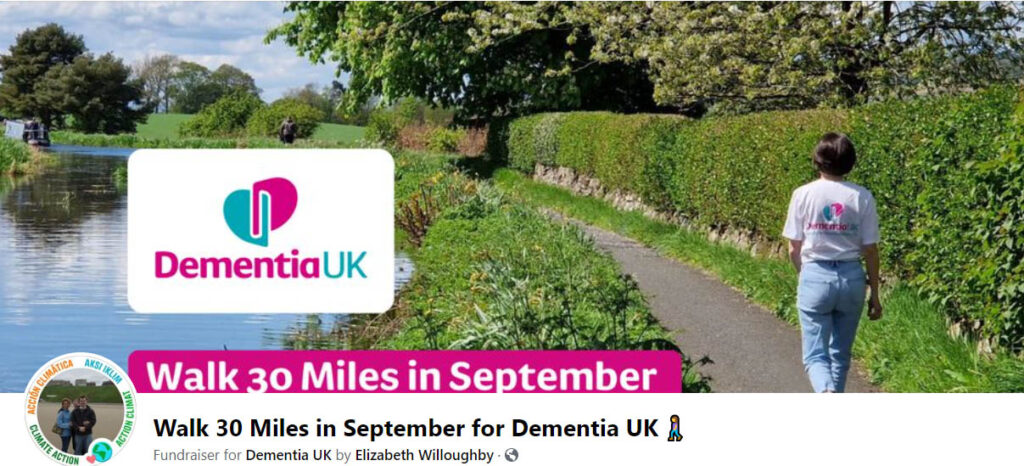 If you see Elizabeth walking up and down the village repeatedly in September, its because she is is raising funds for Dementia UK. Her target is 2 miles a day.
